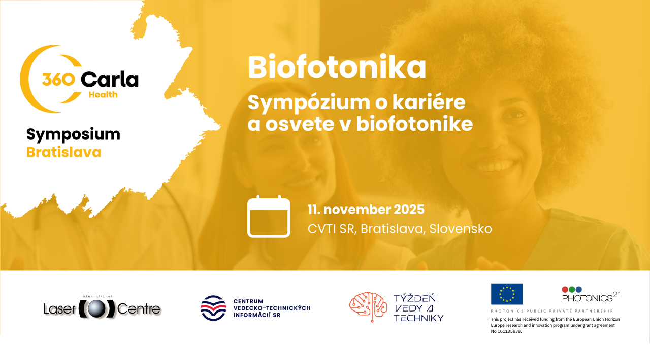 Druhé a najväčšie kariérne podujatie 360 CARLA – Health: Biotech and Medical Photonics Careers Symposium sa uskutoční v CVTI SR 11. novembra 2025 od 9.00 do 18.00 hod. Registrácia je možná prostredníctvom uvedeného QR kódu do 4. novembra 2025. Sympózium je organizované v rámci projektu 360 CARLA programu EÚ H2020. Projekt je koordinovaný Ústavom fotonických vied (ICFO) v španielskej Barcelone.